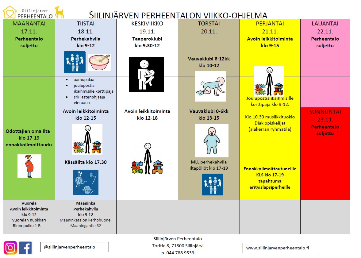 HUOMAA: Syyslomalla noudatamme erilaista viikko-ohjelmaa. Lisäksi arkeen sijoittuvat pyhäpäivät muuttavat viikko-ohjelmaa. Ajankohtainen viikko-ohjelma julkaistaan aina somessa (insta, facebook) ja Perheentalon kotisivuilla etusivulla.
