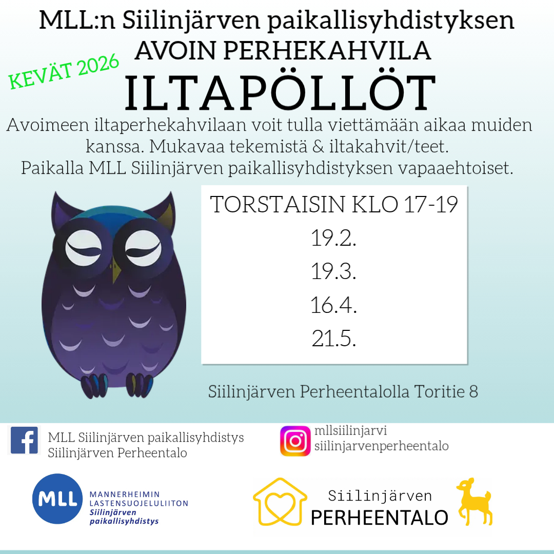 - Iltapöllöt- MLL:n perhekahvila lapsiperheille 1krt kuukaudessa torstai-iltaisin klo 17-19. Perhekahvila on tarkoitettu kaikenikäisten lasten perheille. Perhekahvilaa ohjaa MLL Siilinjärven paikallisyhdistyksen vapaaehtoiset. Lisää tietoa: Siilinjärven MLL.