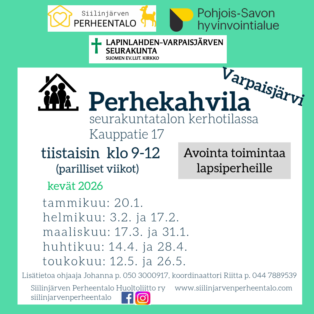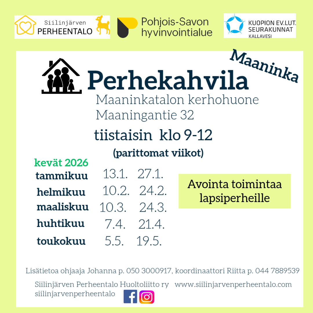 Toiminnan kuvaus: Perhekahvilat ovat kaikille lapsiperheille avoimia kohtaamispaikkoja. Perhekahvila on auki klo 9-12. Voit saapua ja viipya omien aikataulujesi mukaisesti. Perhekahvilassa sekä aikuiset että lapset saavat seuraa toisistaan ja voivat viettää aikaa yhdessä. Joukkoon ovat tervetulleita kaikenikäiset lapset, äidit, isät, isovanhemmat ja muut lapset läheiset aikuiset sekä perhepäivähoitajat. Ohjelmaan kuuluu vapaata ajanviettoa ja toisinaan ohjattua ohjelmaa esim. askartelua, yhteisleikkiä tai muuta teemallista ohjelmaa. Ohjelma ilmoitetaan Siilinjärven Perheentalon somekanavilla; facebook ja instagram. Tarjolla on kahvia/teetä ja leipää. Halutessaan voi ottaa mukaan myös omia eväitä.