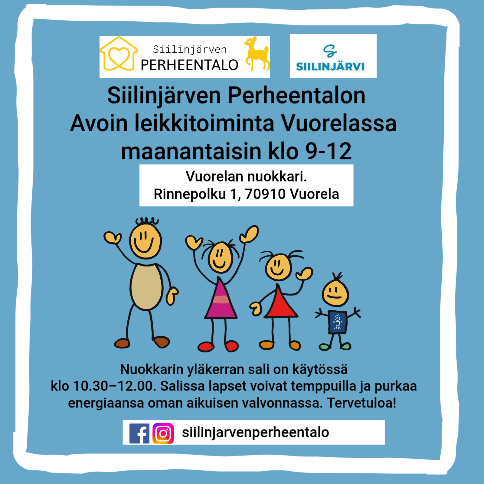 Siilinjärven Perheentalo jalkautuu viikoittain Siilinjärven Vuorelaan ja järjestää kunnan nuorisotiloissa lapsiperheille avointa leikkitoimintaa.