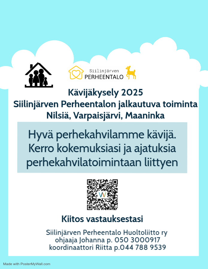 MIKSI JA MITÄ KYSYMME? Kyselyllä kartoitamme kävijöiden mielipiteitä Siilinjärven Perheentalon toiminnasta sekä vaikutuksista lapsiperheiden arkeen. Käytämme saatuja vastauksia toiminnan kehittämistyössä sekä raportoinnissa toiminnan rahoittajalle (STEA, kunta, hyvinvointialue).