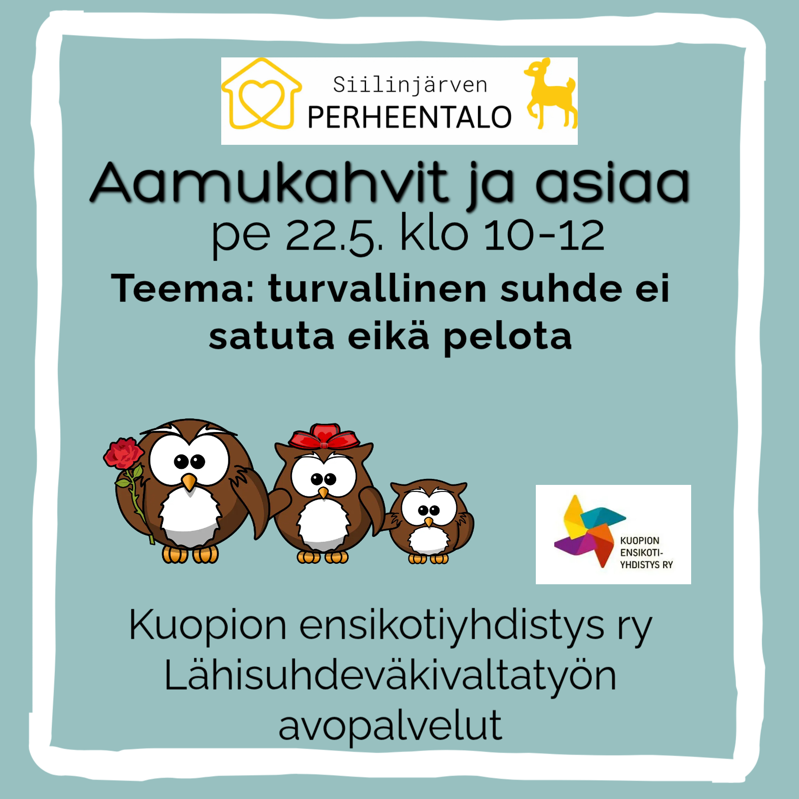 Toukokuussa aamukahveilla keskustellaan Kuopion ensikotiyhdistyksen työntekijöiden kanssa turvallisista lähisuhteista. Saat tietoa mitä on lähisuhdeväkivalta ja miten siihen voi tarvittaessa hakea apua. Jokaisen meidän on hyvä tietää mitä kuuluu turvalliseen lähisuhteeseen ja mitkä ovat väkivallan piirteitä.