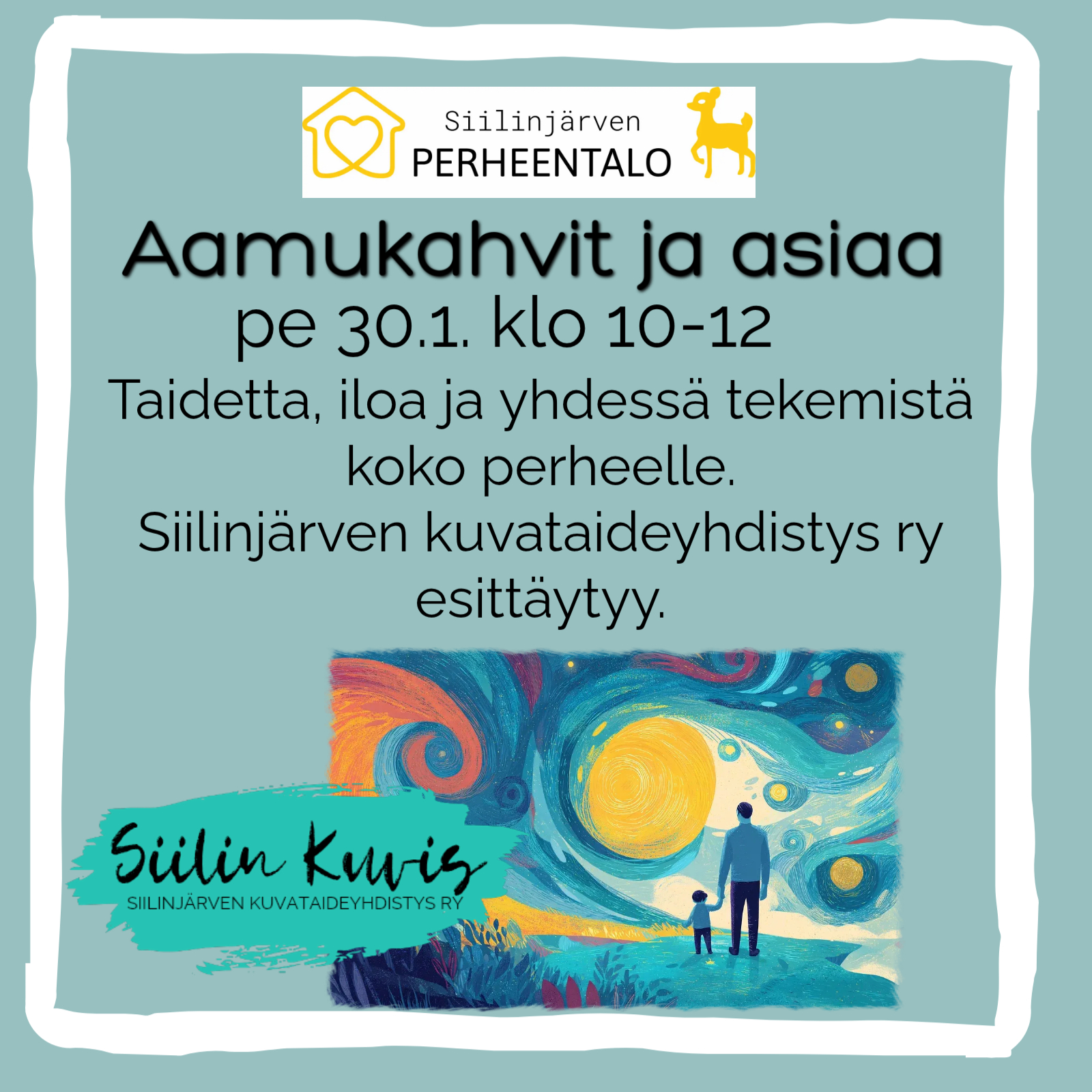 Tammikuun aamukahveilla pääset kuulemaan mitä kuvataiteen kursseja ja toimintaa Siilinjärven kuvataideyhdistys järjestää Siilinjärvellä. Pääset myös kokeilemaan pienen toiminnallisen taidehetken yhdessä oman lapsesi kanssa (askarteluhuone) ja sen myötä saat rohkaisua taiteen maailmaan. Taide kuuluu kaikille!